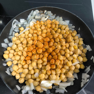 - Una vez hayan transcurrido 8 minutos, la cebolla estará pochada e introduciremos los garbanzos. – Los garbanzos, ya cocinados y habiéndolos tenido en remojo durante 8 horas, los introducimos. Puedes usar de bote, pero ten en cuenta que ya habrán sido procesados anteriormente, perdiendo propiedades.